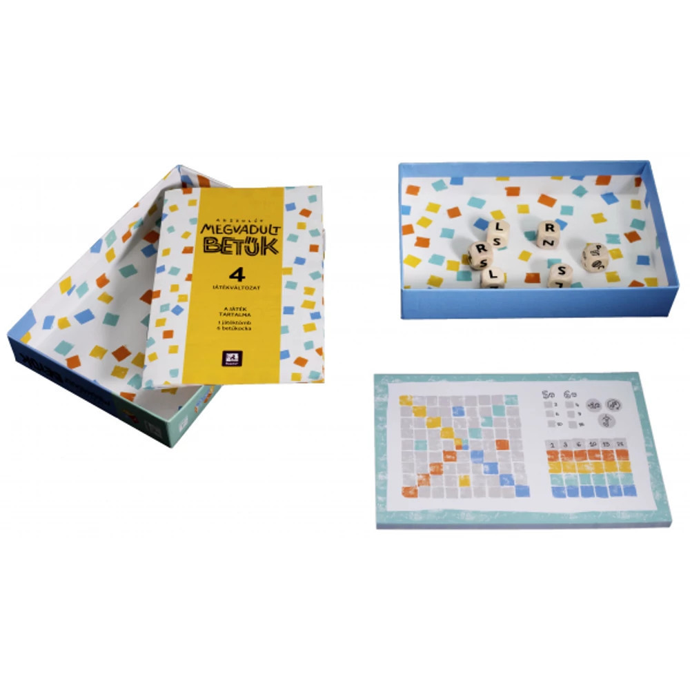 Ideje megregulázni a megvadult betűket! Hat dobókocka áll rendelkezésedre, amelyekkel mássalhangzókat dobsz, és ezeket magánhangzókkal egészíted ki. A cél, hogy összekeverd a betűket, és egy új szót alkoss. A játék 4 különböző módban játszható, így remek családi időtöltés. Játékosok száma: 1-6 fő, Játékidő: 45 perc, Korosztály: 9-99 év.