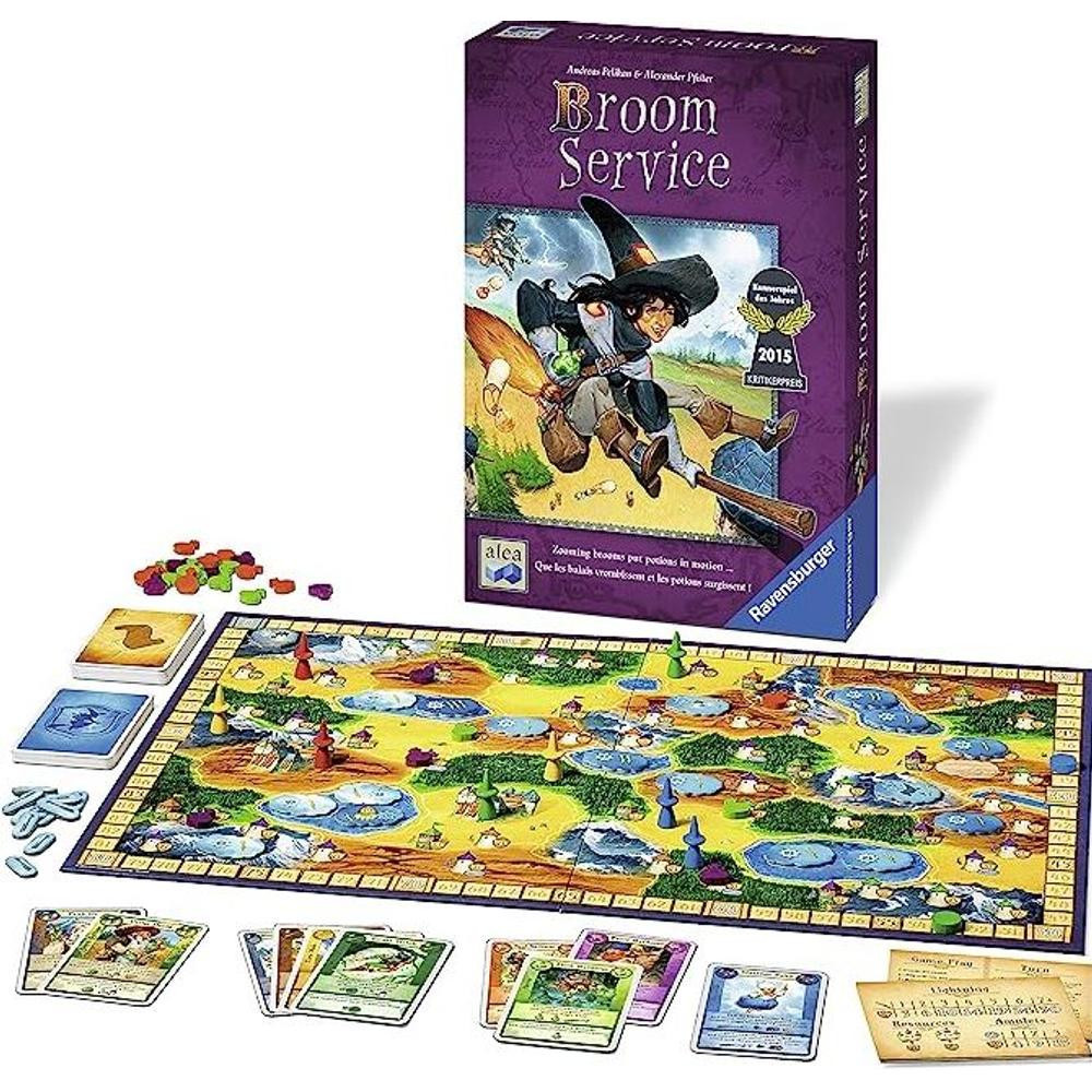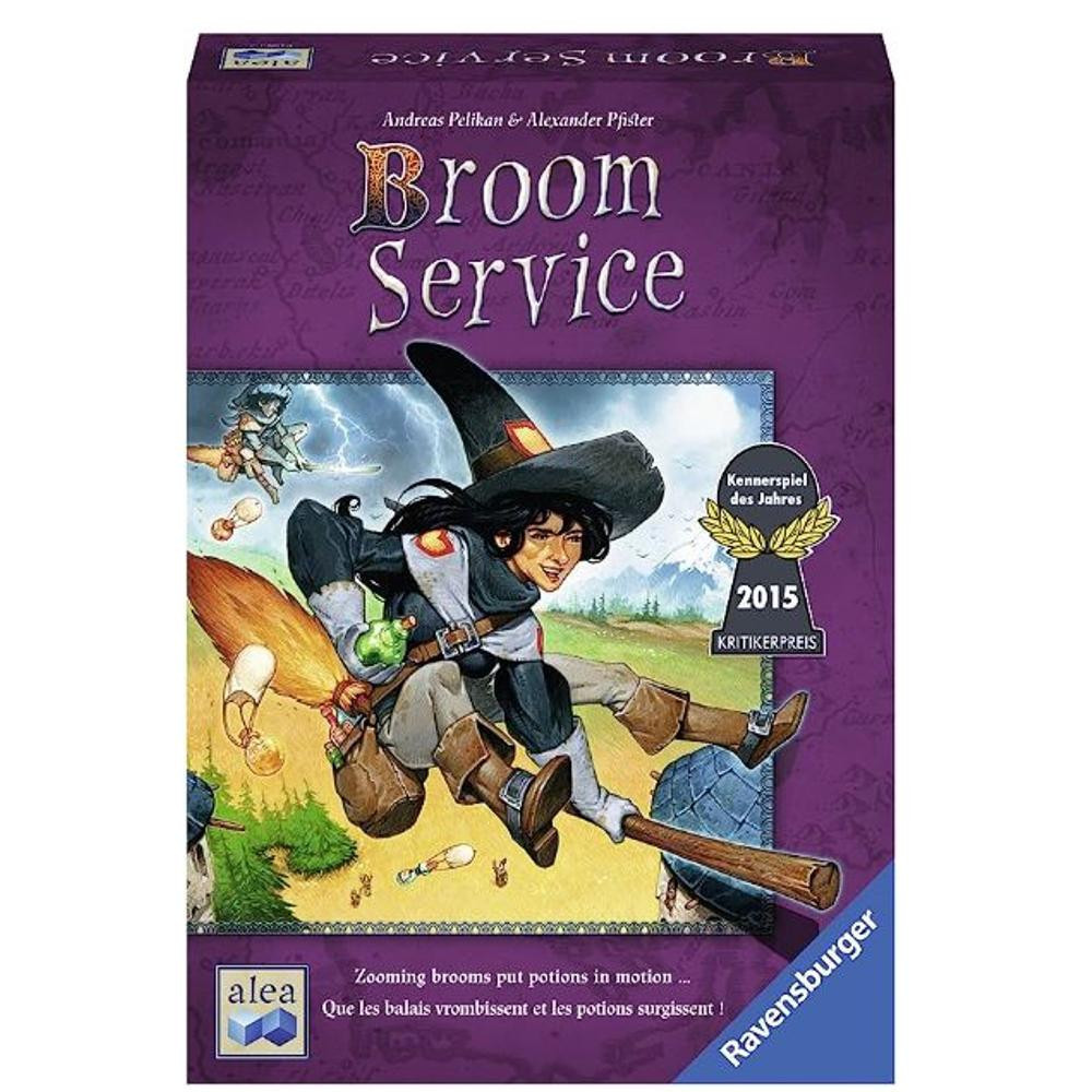 Úgy gondolod, hogy a boszorkányok és varázslók élete csupa játék és mese? Pusztán csak a varázserőből nem lehet hosszú távon megélni, hiszen a rivális mágusok is szeretnék eladásra kínálni tudásuk gyümölcsét. A Broom Service nevű társasjátékban különböző varázserővel rendelkező személyek, mint boszorkányok, varázslók és druidák bőrébe bújsz, célod pedig, hogy te legyél az, aki a legtöbb bájitalt főzi és szállítja le a megrendelőknek. Nem csak a varázserő számít: az üzleti érzék és stratégiai készség ugyanolyan fontos! Vajon te leszel a legsikeresebb mágus a vidéken? A játék kártyavezérelt akciókra épül. Minden játékos 10 lappal kezdi, melyek segítségével különféle tevékenységeket végezhetnek: mozoghatnak a pályán, nyersanyagokat gyűjthetnek vagy bájitalokat kézbesíthetnek. Az akciók kétféleképpen játszhatók ki: van egy gyengébb, de rizikómentes és egy erősebb, de kockázatos verzió. Így szükséged lesz a jó tervezésre és némi kockázatvállalásra, hogy a kör végén a legtöbb profitot érhesd el. A doboz tartalma: egy kétoldalas játéktábla, 15 fabábú, 5 fa jelölő, 50 szerepkártya, 10 eseménykártya, 32 felhő alakú jelölő, 15 amulett, 24 varázspálca, 2 játékösszefoglaló, 17 tájkép jelölő és egy 12 oldalas szabálykönyv. Készen állsz arra, hogy te légy a legsikeresebb mágus az országban?