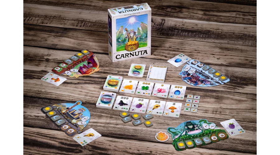 A Carnuta egy taktikus, mégis könnyed, kártyaalapú társasjáték 2–4 játékosnak, amelyben druidaként összetevőket gyűjtötök és kombináltok, hogy a szertartás végére a lehető legtöbb pontot szerezzétek. A győzelemhez okos döntésekre, jó időzítésre és a megfelelő alapanyagok összehangolására lesz szükség. Egy körben minden játékos két akciót választ a négy lehetőség közül: kártyákat húz, rúnaköveket szerez, kijátssza az összetevőket, vagy áthangolja a rúnáit. Az összetevők nappali és éji típusúak, kijátszásuk pedig a rúnakövek állásától függ, így a tervezés és a ritmusérzék kulcsfontosságú. A kártyák típusonként külön oszlopokba kerülnek, a pontozás pedig az így kialakított összetevő-kombinációkra épül: vannak lapok, amelyek a szetteket jutalmazzák, mások az egyedi gyűjtést erősítik, ezért többféle stratégia is életképes. A speciális kártyák – például a dzsókerként működő só – tovább növelik a variálhatóságot, és új döntési helyzeteket teremtenek.