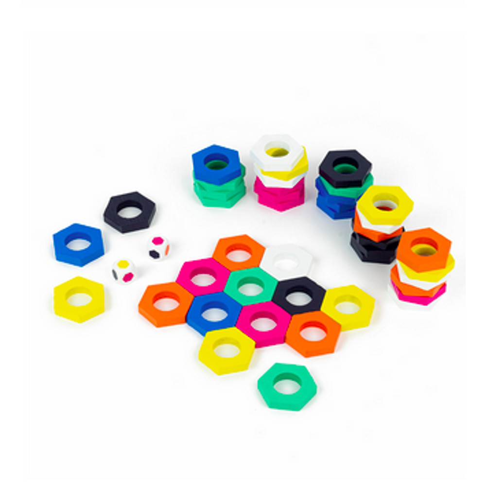 Dobd el a színes kockát, és tudd meg, melyik fából készült, színes hatszöget kell mozgatnod. Próbáld úgy áthelyezni, hogy három vagy annál több darabból álló szettet kapj. Célod, hogy te zsebeld be a legtöbb színes hatszöget, és megnyerd a játékot – de ne csak a szerencsére, a stratégiádra is hagyatkozz!