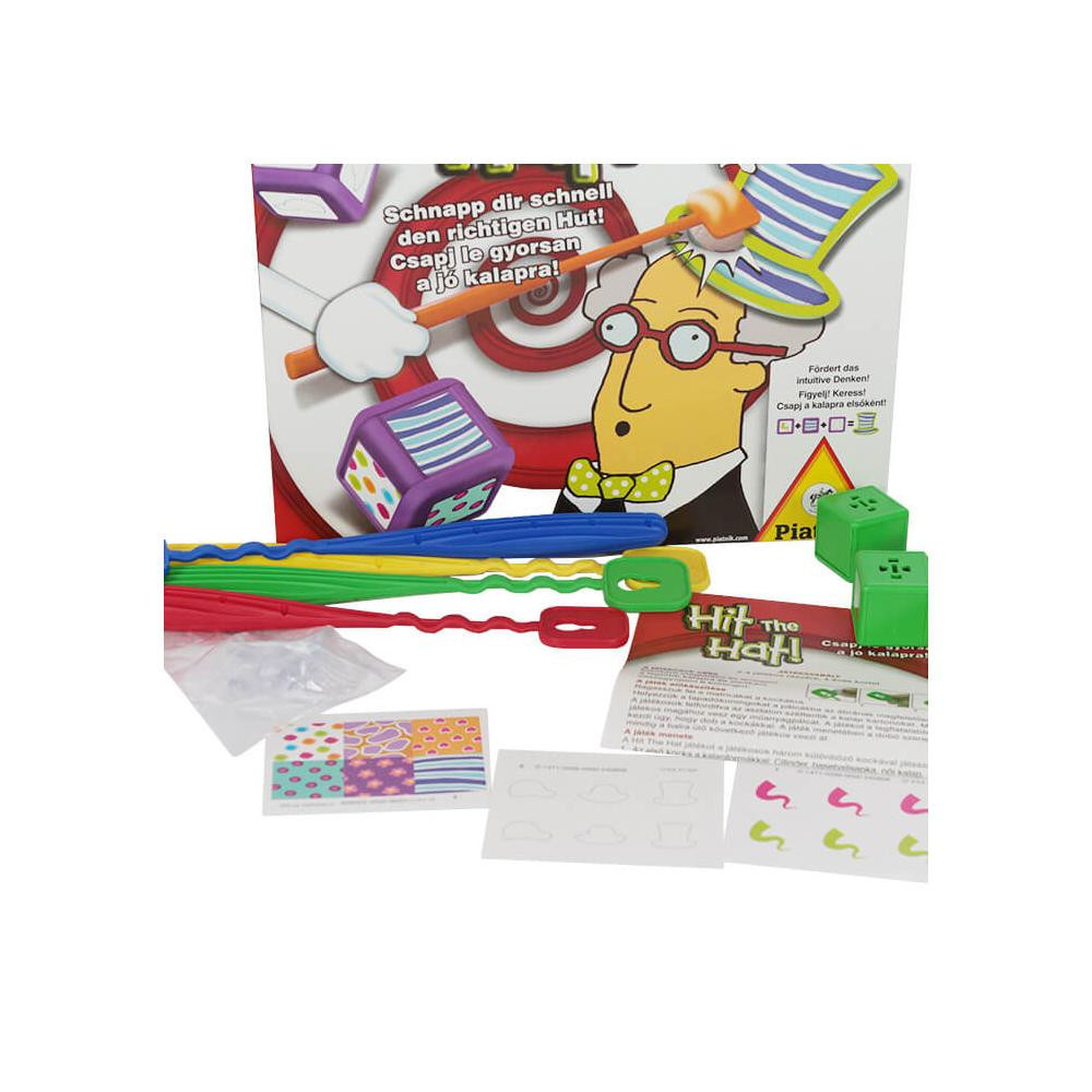 - A játék tartalma: 36 kalap, 4 műanyag pálca tapadókoronggal, 3 kocka matricával, 20 műanyag korong, egy játékszabály