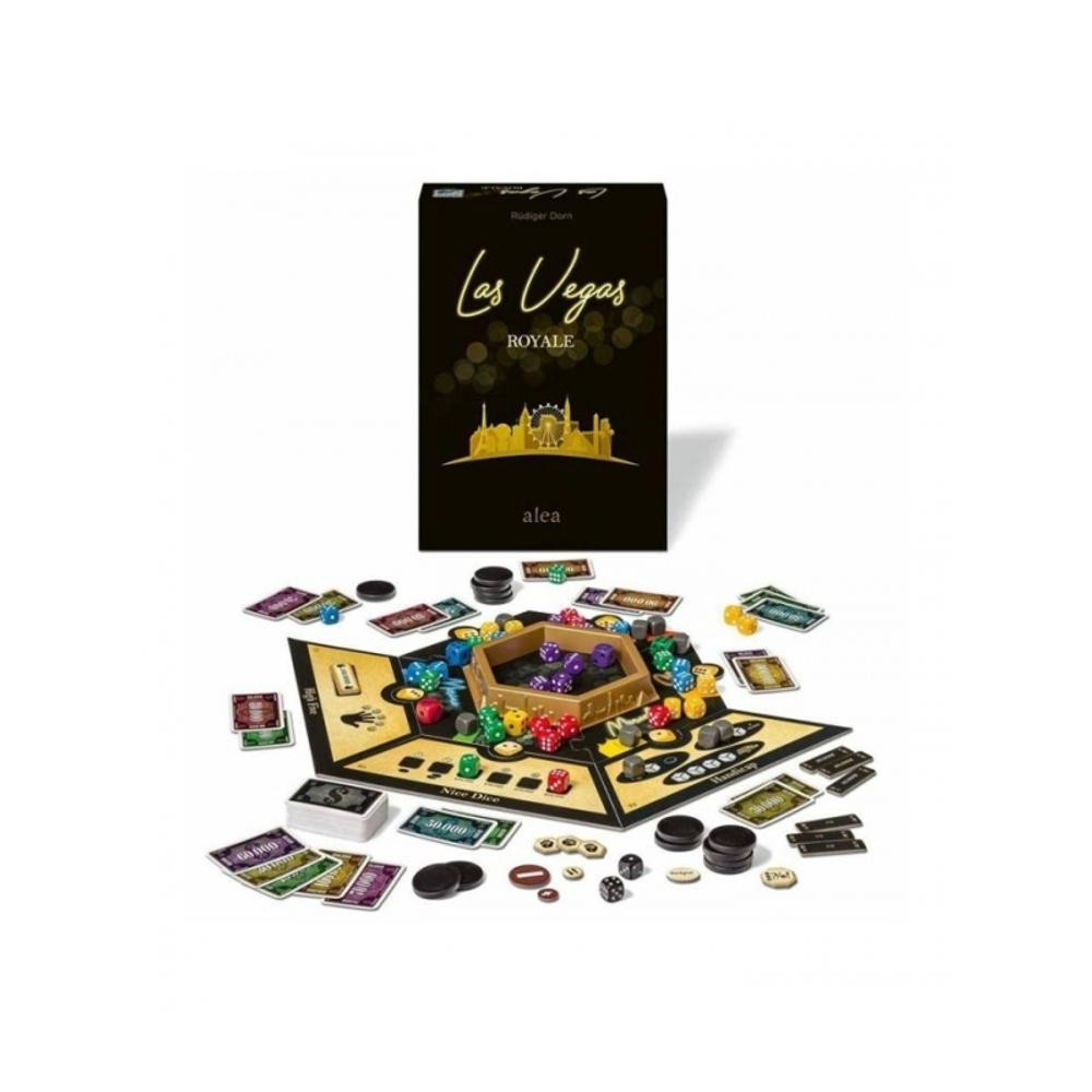 Akkor próbáld ki magad a szerencsejáték izgalmas világában! Látogasd meg a legrangosabb las vegas-i kaszinókat, és zsebeld be mindegyikben több mint 50.000 dollárt! Na, hogy hangzik? A "Las Vegas Royale" egy olyan könnyen tanulható kockajáték, amit már 8 éves kortól lehet játszani. A játék a kockadobásra épül és terület befolyásolás mechanizmusokra. Összesen hat kaszinóba kell betérni és szerencsét próbálni. A játék tizenkét kiegészítőt tartalmaz, és ha még izgalmasabb élményre vágysz, minden kaszinóhoz véletlenszerűen elhelyezhetsz egy kiegészítő lapkát. Ezek az extra lapkák speciális képességekkel bírnak, amelyeket a játékosok kockák elhelyezésével aktiválhatnak. Minden játékos számára elérhető egy nagyobb kocka is, ami két normál kockának felel meg.