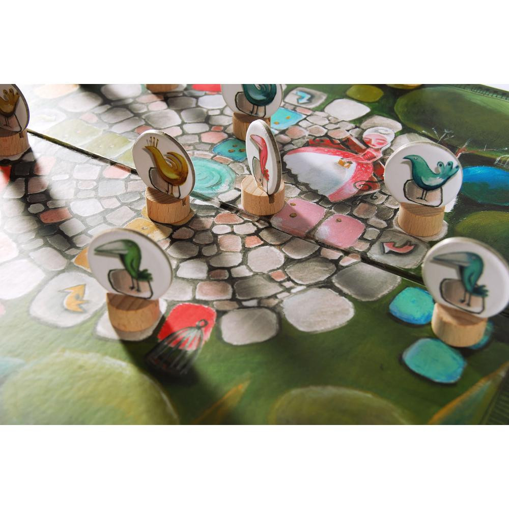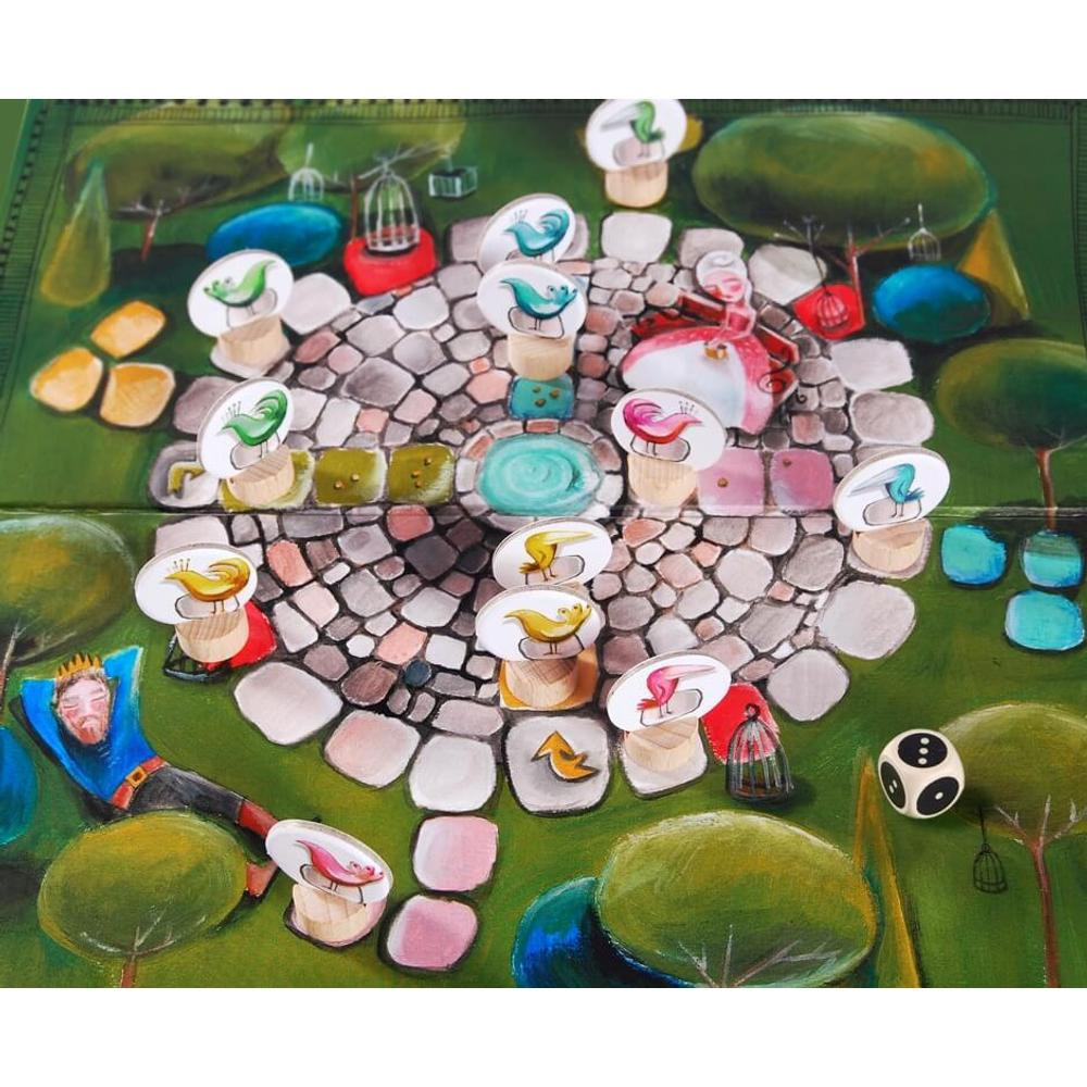 Dani herceg boldogsága határtalan! Olyannyira, hogy a kertje énekesmadarait szívének hölgyének szeretné ajándékozni. A Madárfogó társasjátékban ki lesz a legügyesebb, aki megmenti a madarakat a kalitkától és eljuttatja őket a hercegnőhöz? Ez a játék egy klasszikus "lépegetős" játék egy kis csavarral, amely minden korosztály számára izgalmas lehet.