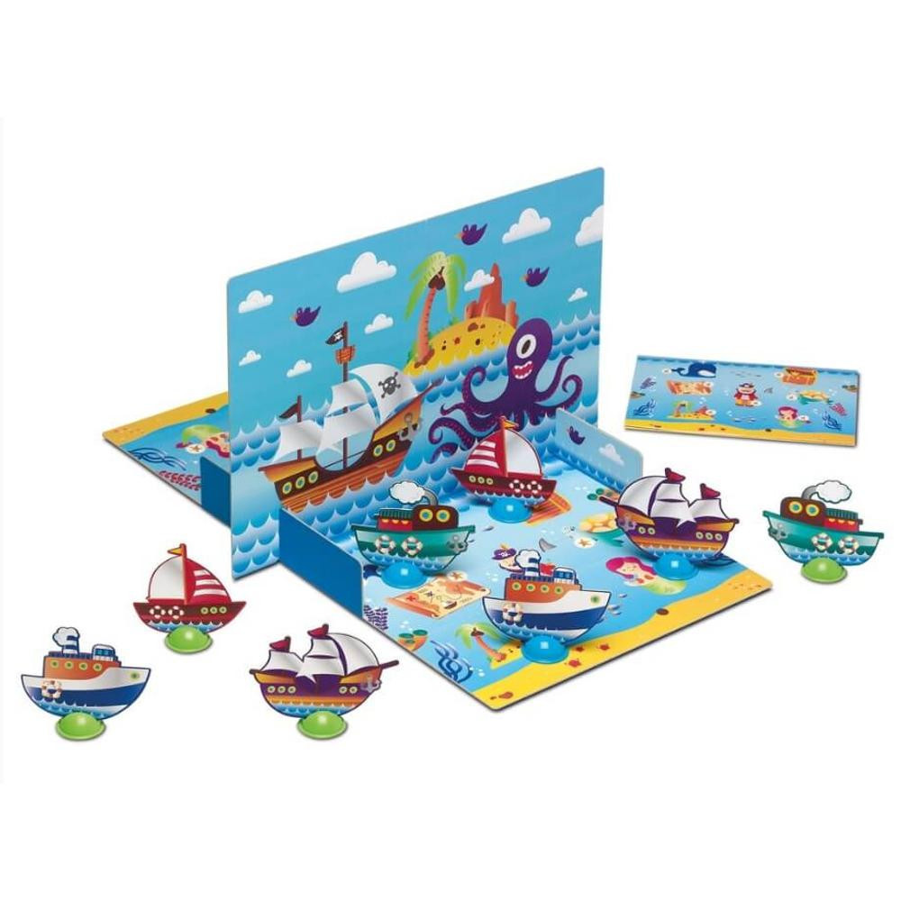 Fedezd fel, hogy a legnagyobb és legfélelmetesebb kalózok hova rejtik a hajóikat az óceánon és a szigetek között! E játékban nem csak a saját hajóidat kell elrejtened, hanem az ellenfeleidét is meg kell találnod. A játéktábla az asztal közepén kap helyet a kihívás kezdetén; a játék célja, hogy megtaláld ellenfeled összes hajóját, mielőtt ő találná meg a Tieidet. Előkészületek: Osszátok el a 8 hajót úgy, hogy mindenkinek 4-4 különböző jusson és állítsátok bele őket a műanyag talpakba. A játékszabály szerint a fiatalabb játékos kezd kérdezni, következetesen jelölve a válaszokat a jegyzettömbön. A játék végén az lesz a győztes, aki elsőként találja meg a másik játékos 4 hajóját. A doboz tartalma: A dobozban egy játéktáblát, elválasztó kartont, 8 hajót, 8 műanyag talpat és 2 jegyzettömböt találsz. A játék fejleszti a következő képességeket: memória, érvelés, képzelőerő, szóbeli kifejezőkészség, optikális-manuális koordináció, térérzék, motorikus készségek, érzelmek és önbecsülést. Tedd próbára képességeidet és éld át a kalózok világát!