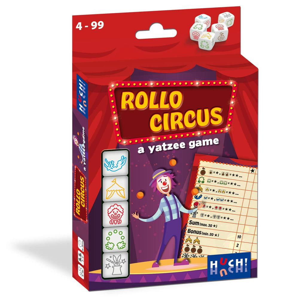 Megérkezett a cirkusz a városba! A fellépők és a műsorszámok a kockákon rejtőznek. Minden gurítás után pontokat gyűjthetsz a színes képekért. Vajon kié lesz a legszerencsésebb kéz? A cirkusz a varázslat birodalma, és ebben a kockajátékban a mágia a kezedben van! Próbáld meg megtalálni a bohócokat, artistákat vagy a nyuszis bűvészcilindereket, és gyűjtsd a pontokat! Ha mind az öt kockán ugyanazt a képet látod, kiáltsd örömmel: Rollo Circus! Ez a játék izgalmakkal teli szórakozást kínál kicsiknek és nagyoknak egyaránt, ahol a pontok gyorsan gyűlnek, és a körök pörögnek.