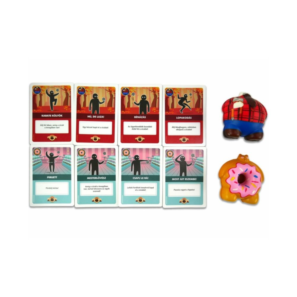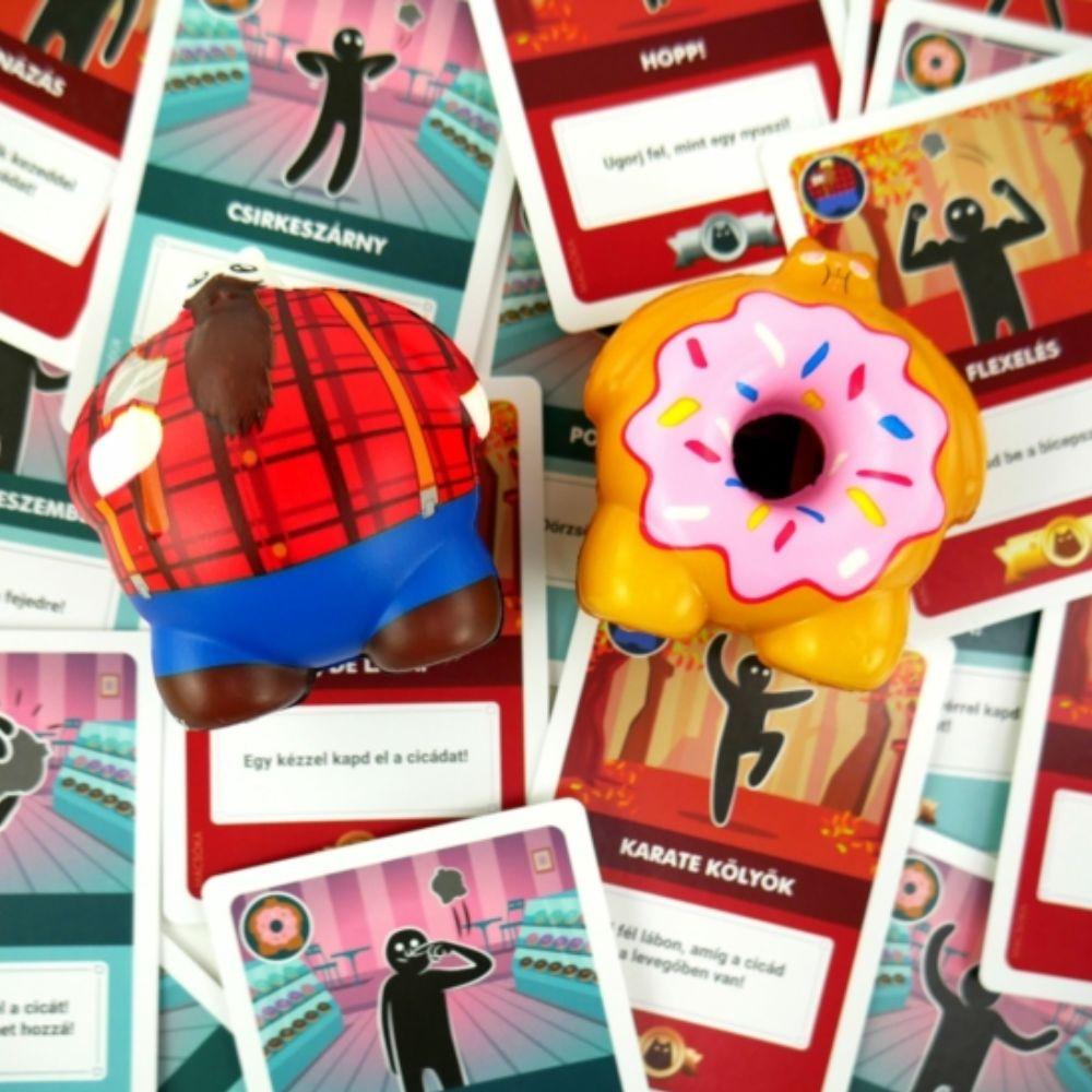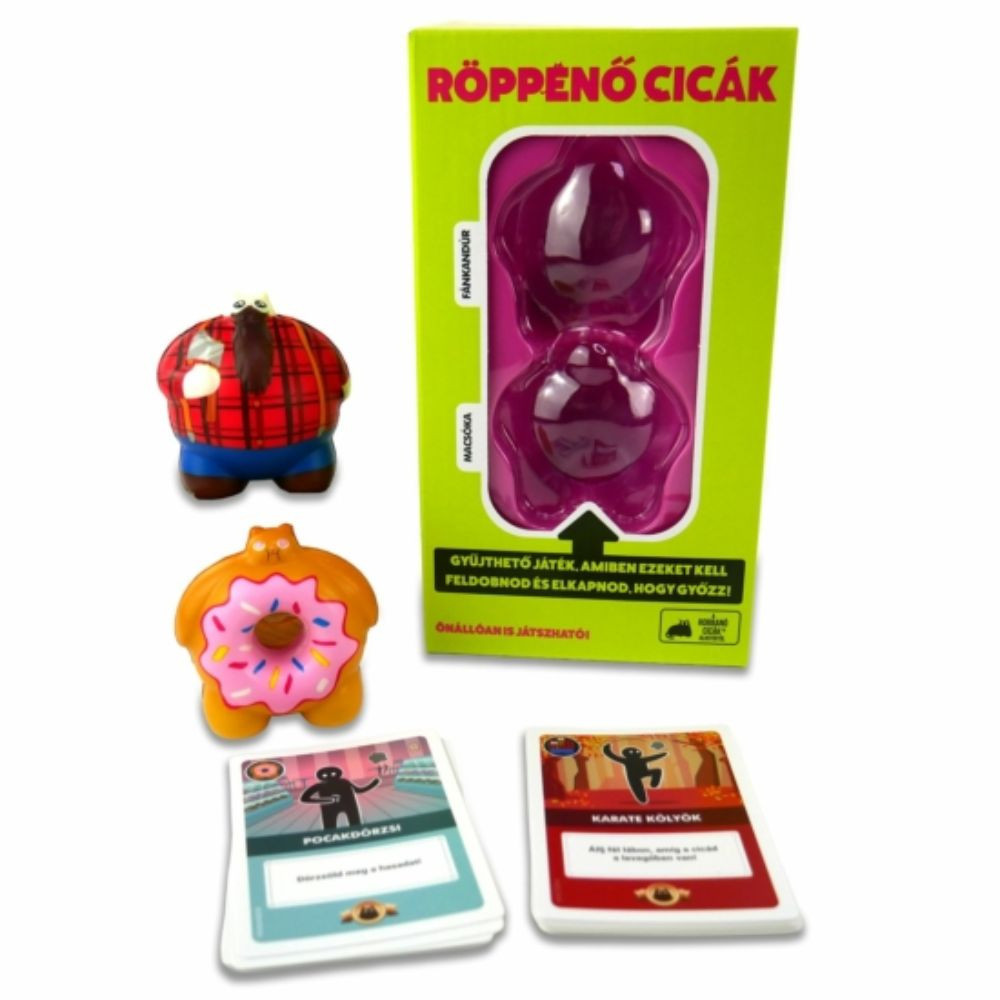 Két új cica érkezett, Macsóka és Fánkandúr, hogy feldobják a Röppenő cicák játékélményét. Az új figurák és 24 vadonatúj mutatványkártya garantáltan fokozzák a kihívásokat és a nevetést. Macsóka, a sármos kalandor, és Fánkandúr, a falánk bohóc, új trükkökkel gazdagítják a játékot, ami akár egyedülálló partijátékként, akár az alapjáték kiegészítőjeként is működik. A játékmenet a megszokott: felemeljük a cicát, teljesítjük a mutatványokat, és elkapjuk, mielőtt földet érne. A kihívások sikeres teljesítésével újabbakat állíthatsz magad vagy mások elé, de ha elrontod, kártyáktól kell megválnod. A győzelemhez pedig öt mutatványt kell hibátlanul teljesítened egyetlen dobással. Ez a gyors és vicces ügyességi játék 2–4 főnek szól, és a puha, biztonságos anyagú cicák gyerekek számára is ideálisak. A csomag tartalma: 2 röptethető cica és 24 mutatványkártya.