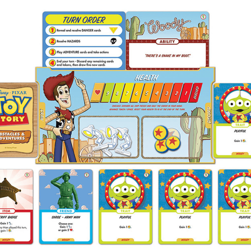 Lépj be a kedvenc Toy Story világodba, és élvezd a közös kalandokat a barátaiddal a Toy Story: Obstacles & Adventures társasjátékban! Ebben a kooperatív játékban a játékosok együttműködve küzdenek meg a különféle kihívásokkal. Használjátok a 84 kártyás paklit, gyűjtsetek erőforrásokat, és küzdjetek meg az akadálykártyákkal! A játék tartalmaz 6 karakterkártyát, 4 játéktáblát, és mintegy 30 akadálykártyát, amelyek mind különböző helyszíneken játszódnak a Toy Story univerzumában. A játék izgalmas és dinamikus, minden játszma új kalandot rejteget. Szervezd meg a stratégiátokat, és győzzétek le közösen a próbatételeket a cél elérése érdekében!