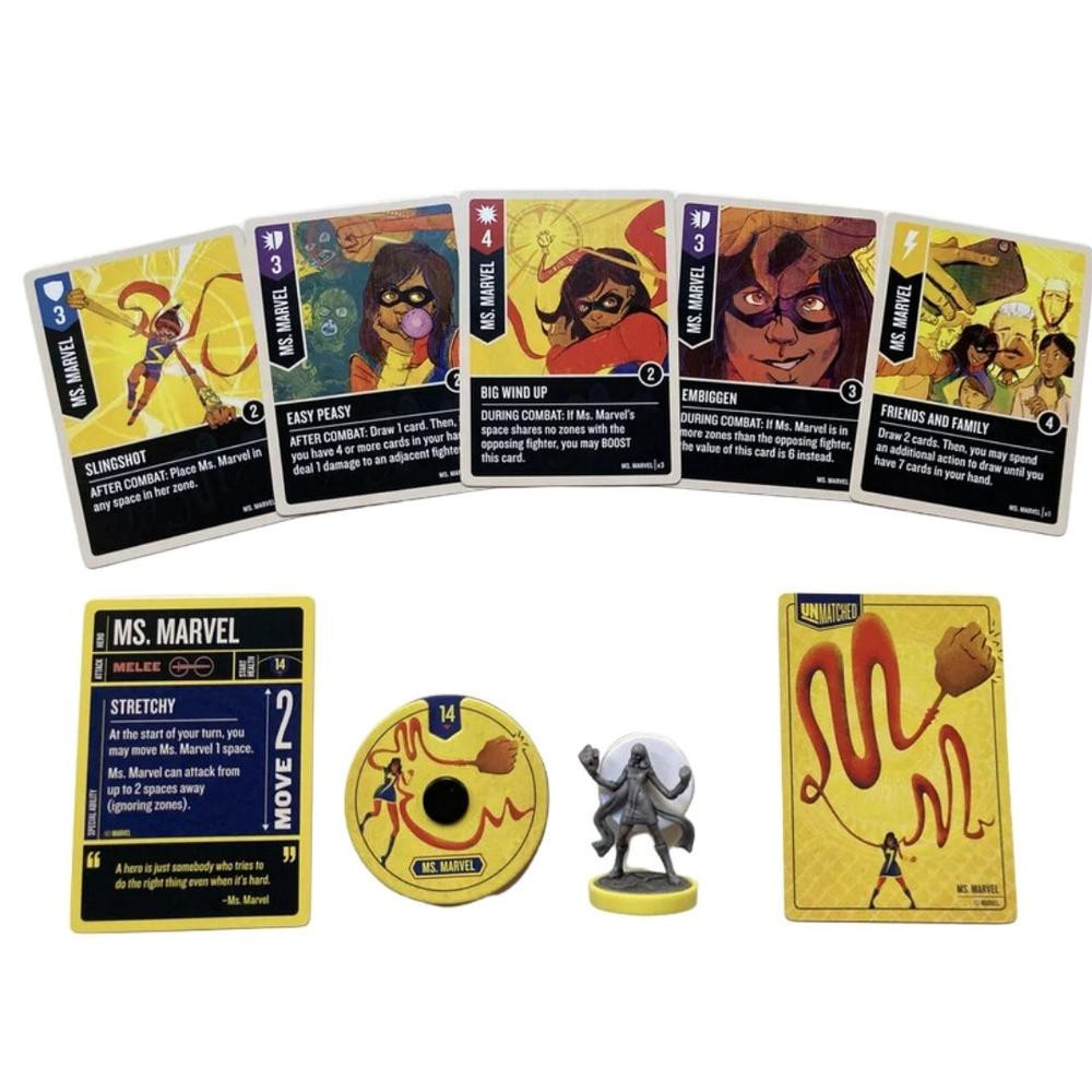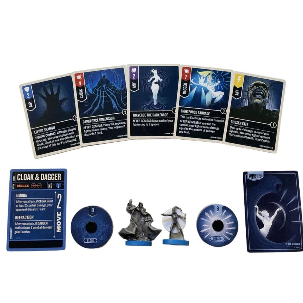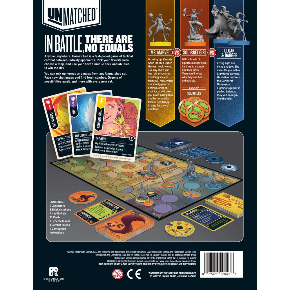 Csatlakozz az Unmatched arénáihoz a Teen Spirit világában, ahol senki sem egyenlő a csatatéren! Válaszd ki a saját hősödet, legyen az Mókuslány, Tőr és Köpeny vagy Ms. Marvel, és vágj bele az epikus küzdelmekbe! Ez a lenyűgöző akciódús taktikai játék lehetővé teszi, hogy te is egy legendás harcos bőrébe bújj, miközben stratégiai képességeid teszed próbára. Minden játékkör során két akciót hajthatsz végre: tervezés, mozgás vagy támadás. A tervezés a legegyszerűbb akció, amelyet egy villámikon jelöl a kártyákon. A mozgás során húzol egy kötelező kártyát, majd mozgatod hősöket a pályán a mozgási értékük szerint, de vigyázz! Ha kifogysz a kártyákból, megszámláltattak köreid! A támadás fázisa a legösszetettebb, a játékosok által kiválasztott kártyákat egyszerre felfedve döntik el, hogy ki a győztes. A csomag tartalma: