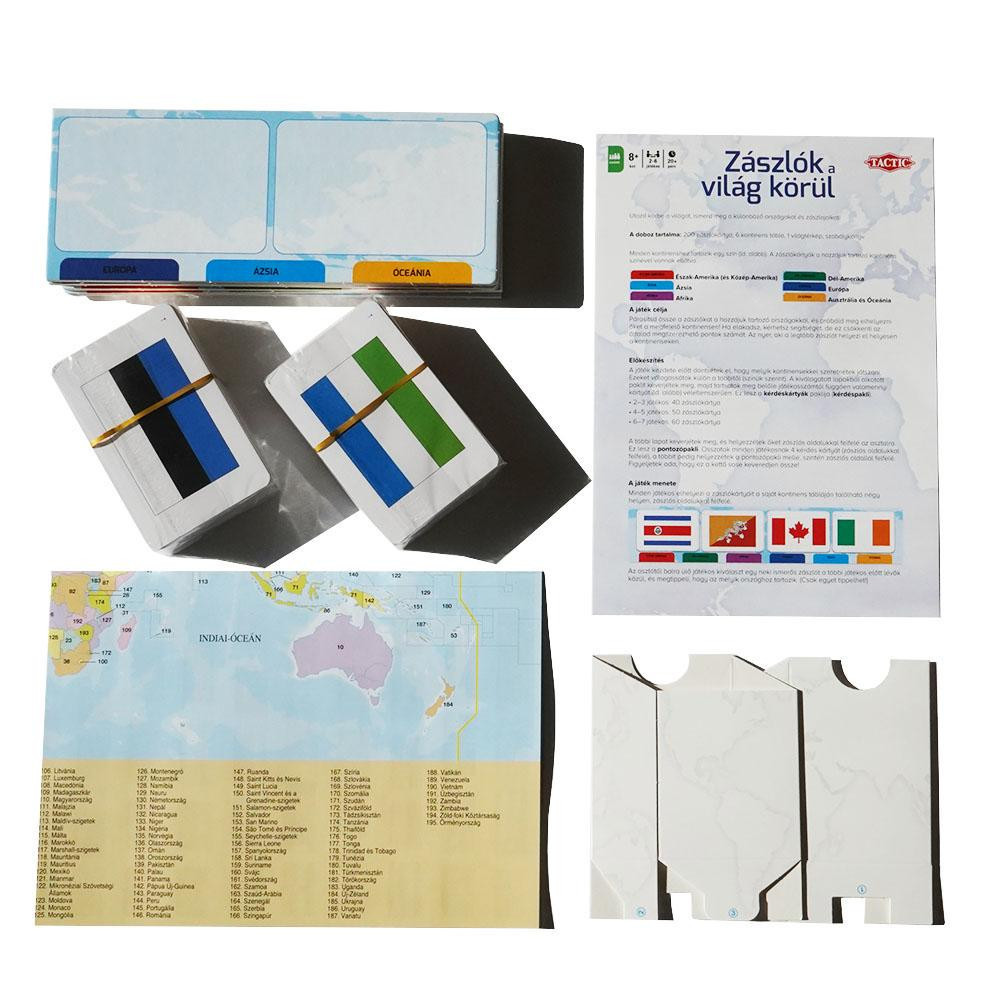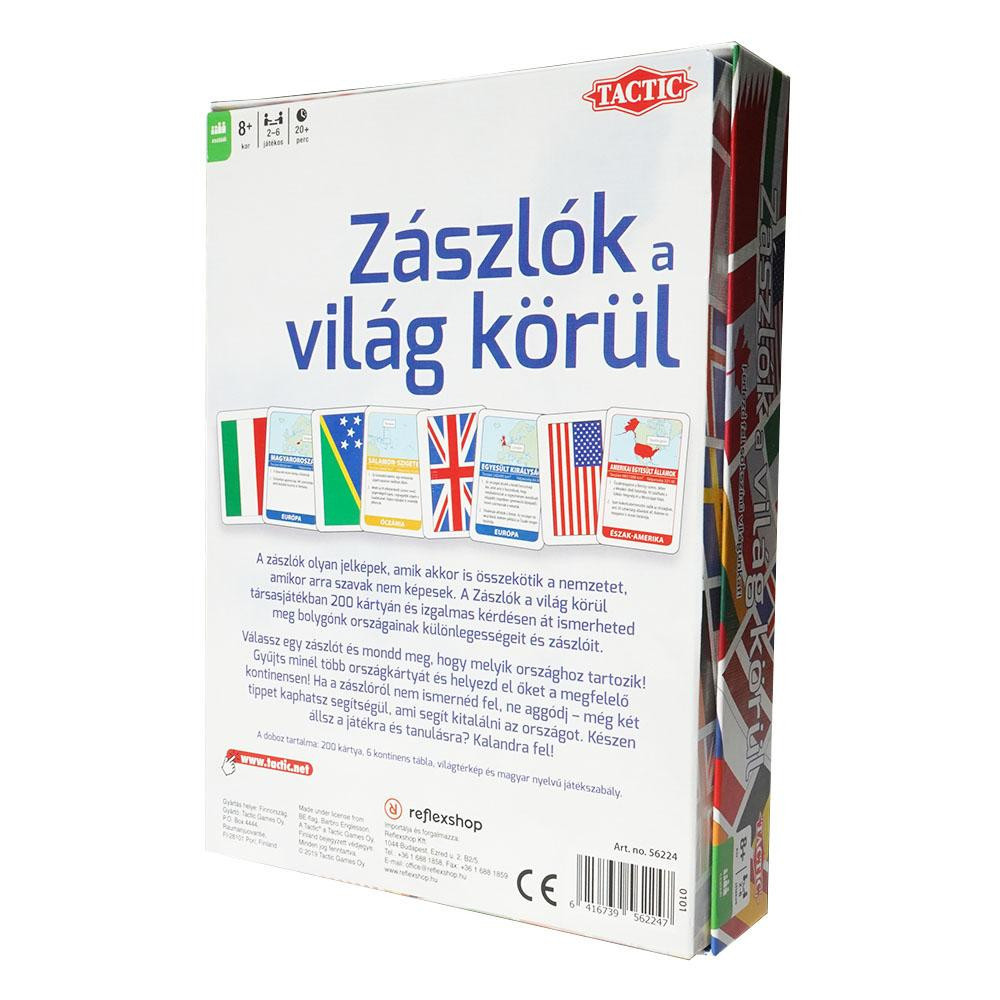 Fedezd fel a világ különböző országait, miközben szórakozol a Zászlók a világ körül társasjátékkal! Ez a játék 200 kártyán keresztül vezet téged, melyeken izgalmas kérdésekkel találKOZHATSZ a világ zászlóiról és országairól. Válassz egy zászlót és mondd meg, melyik országhoz tartozik! Ha elakadnál, még két tippet is kaphatsz segítségül. Cél, hogy minél több országkártyát gyűjts, és a megfelelő kontinensen helyezd el őket. Játékelemek, mint a 200 kártya, 6 kontinens tábla, világtérkép és magyar nyelvű játékszabály várnak rád. Készülj a tanulásra és kalandra!