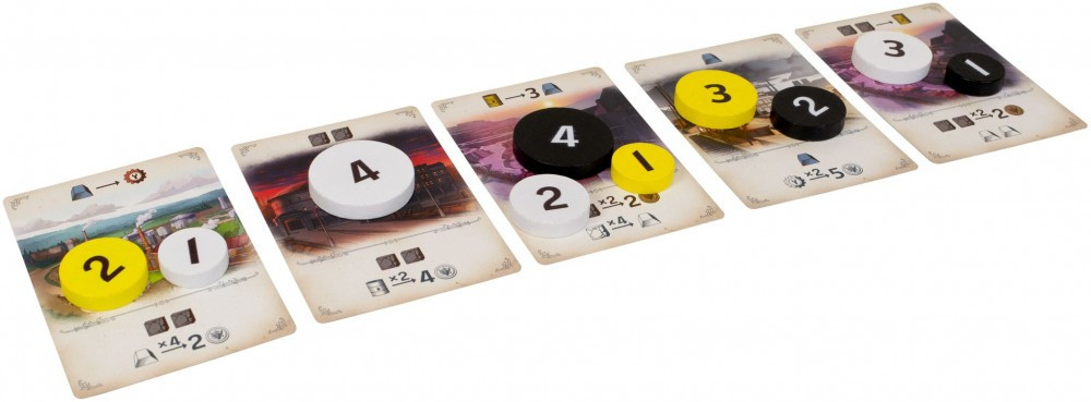 A játékot minden játékos egy véletlenszerű indítókártyával, a kártya tetején látható nyersanyagokkal és négy színes koronggal kezdi, amelyek értéke 1-4.