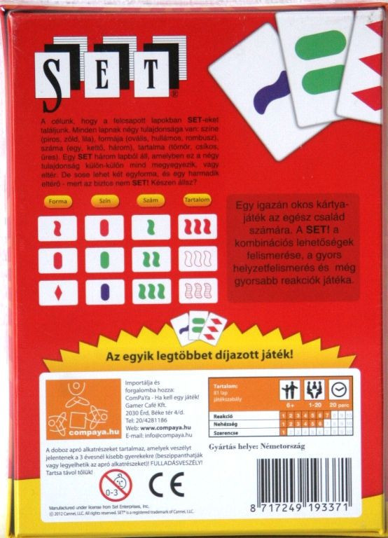 A SET egy igazán okos kártyajáték az egész család számára. A kombinációs lehetőségek felismerése, a gyors helyzetfelismerés és még gyorsabb reakciók játéka.
