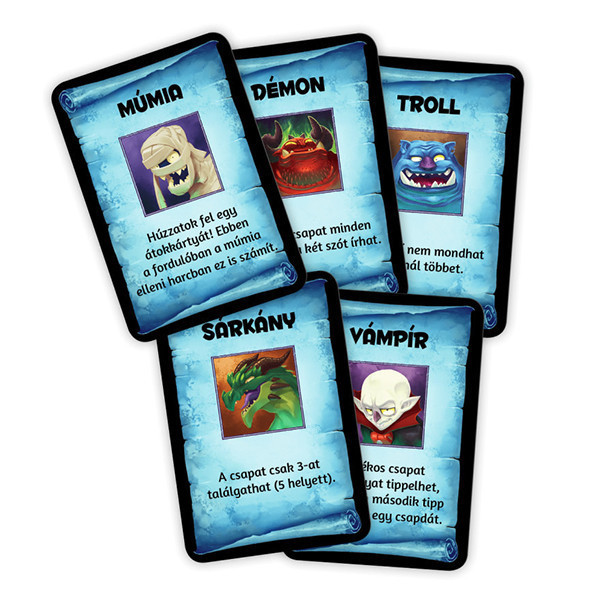 A játékot 4 vagy több játékos játszhatják, és ajánlott életkor 12 évtől felfelé. A játék időtartama körülbelül 30 - 60 perc, és garantálja az izgalmas és szórakoztató játékélményt. A játék tartalmaz 50 kétoldalú kártyát, amelyek 400 fantasy és 400 modern szót tartalmaznak, valamint 10 szörnykártyát, 10 átokkártyát, 7 karton teremlapkát, 4 kartonkönyvecske, 2 karton csapatfigurát, 5 karton szörnyfigurát, 2 kartonfáklyát, 3 műanyag talpat, 1 tömb szólistagyűjtőt, 2 ceruzát, homokórát, szabálykönyvet és áttekintőt.