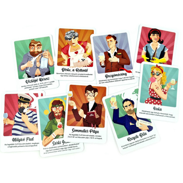 Hajnóczy Soma kétszeres bűvész világbajnok izgalmas partijátékában, alkudozni és egyezkedni is kell, pörgős a játékmenet, és természetesen a fröccsök mellől a zsíros deszka sem hiányzik. Retró hangulatú színvilág a kártyákon és a karakterek kinézetében, szódásüveg, régi tízes... Nagyon szuper! Egy játék körülbelül 30-40 perces, de egy játék biztos nem lesz elég. A szabályok nem bonyolultak, nagyjából 5-10 perc alatt megtanulhatók.