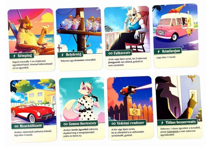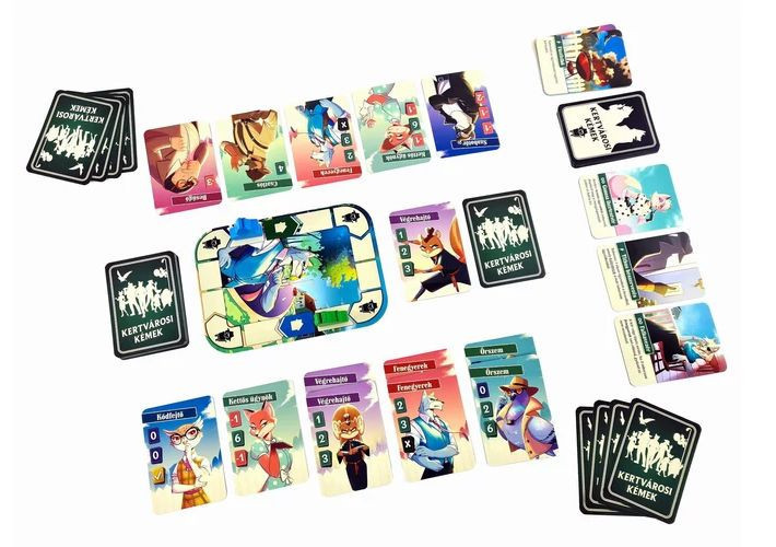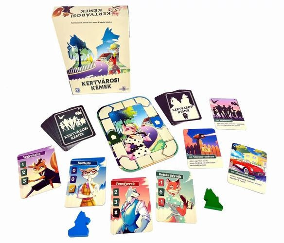 A "Kertvárosi kémek" egy izgalmas és versenyző szellemű kártyajáték 2-4 játékos részére, amely ötvözi a blöffölést, a stratégiai készletgyűjtést, és a versenytársak identitásának felfedésére irányuló versenyt. A játékosok nyugdíjas kémeket alakítanak egy színes, állatszereplőkkel teli világban, ahol a pontszerző vagy különleges hatásokat kiváltó kártyákkal próbálják túljárni egymás eszén.