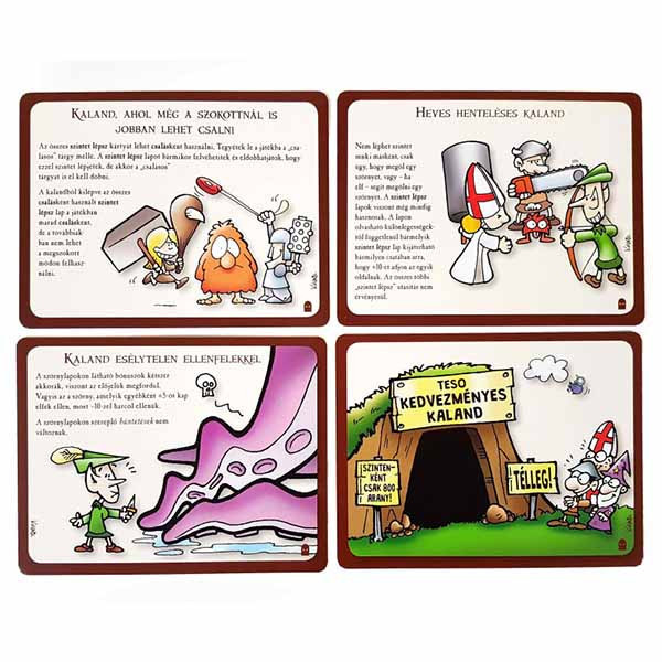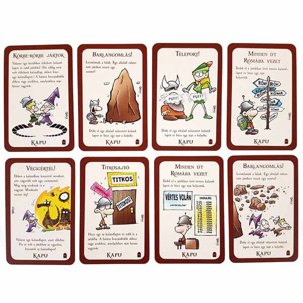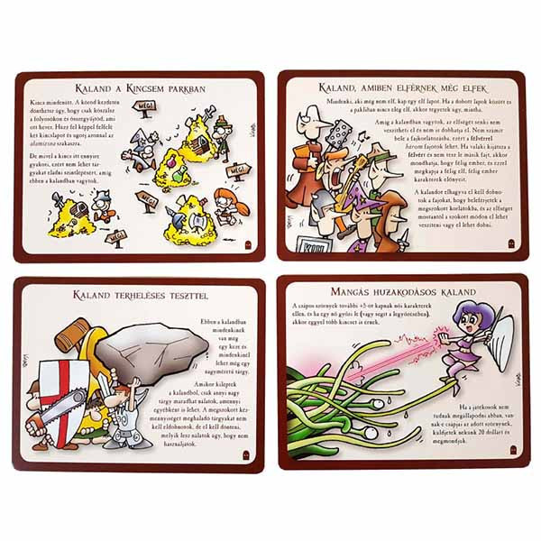 A 20 óriási méretű lap mindegyike az egész csapatra, sőt még talán a szörnyekre is ható különleges szabályt visz bele a játékba. A 16 kapulap segítségével egyik kalandtól a másikig ugrálhattok az arany és a dicsőség nyomában.